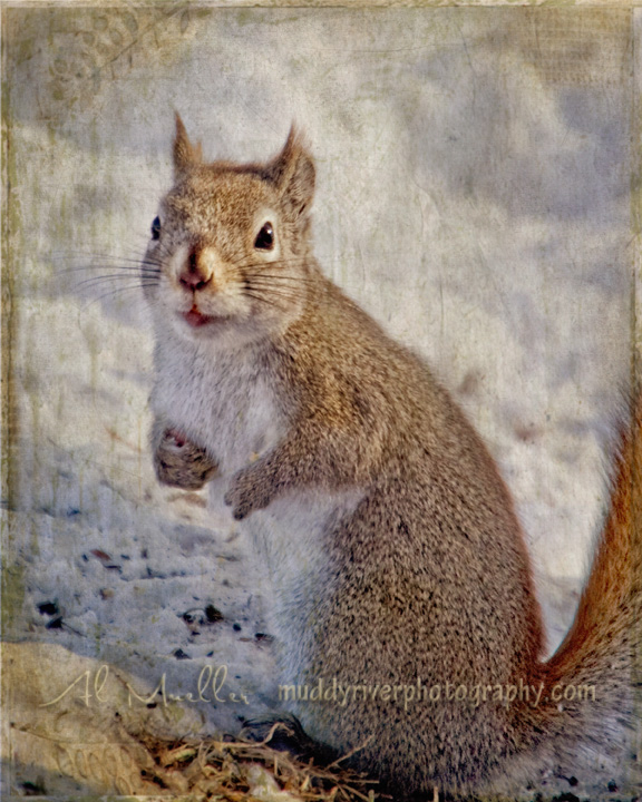 It seems that every spring when the weather starts to warm a little, I get overly excited about getting out and shooting all the nature subjects I imagined would be profusely abundant. The reality turns out to be quite different and I will have to be patient a bit longer. In the meantime I will take what I can and use my extra time on processing. This squirrel image was taken a couple of weeks ago. He has a good expression but the background was dull and distracting. Fortunately textures were close at hand and when incorporated with the image bring the viewers focus back on the innocent little squirrel.